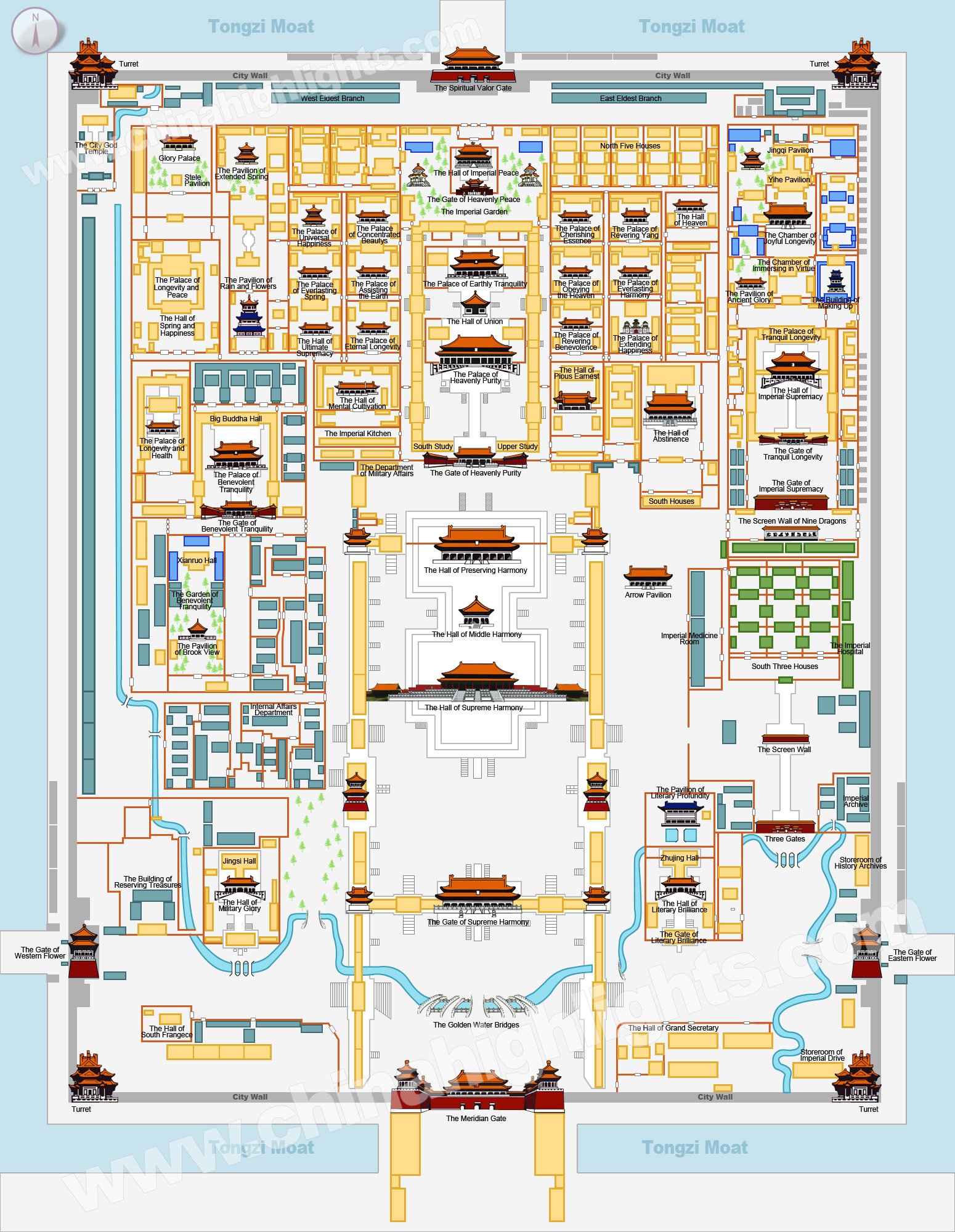 - Route: Hall of Supreme Harmony → Hall of Middle Harmony → Hall of Preserving Harmony → Palace of Benevolent and Tranquility → Palace of Longevity and Health → Palace of Heavenly Purity → Hall of Union → Palace of Earthly Tranquility → Palace of Eternal Longevity → Palace of Concentrated Beautys → Imperial Garden → Corner Tower